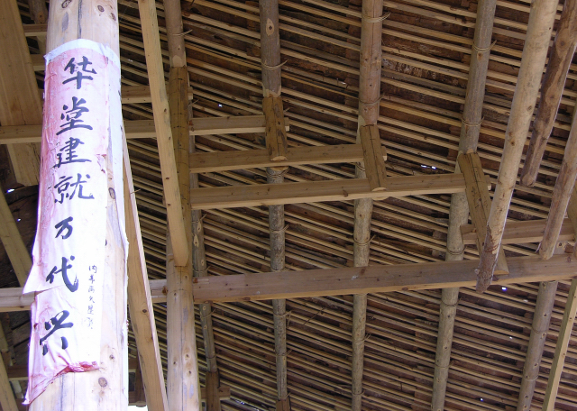 This picture is of the support structure for the roof. After the support beams are place, bamboo strips are nailed on top of them and these are covered with large wood shingles which are then covered with roof tiles. No, the writing on the red paper is not a building permit....it is prayer to the ancestors.
