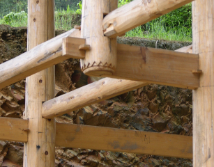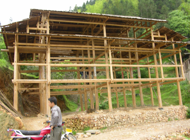 Typically, most minorities use a Chinese variation of post and beam technique with mortise and tendon joinery. Having always been one who could not pass up a construction site, I took the opportunity to ask questions and take pictures of this house under construction in a Zhung ethnic minority village outside Sanjian. The structure is at least 45 feet wide. The scale is visually thrown off because, though he looks much closer, the man is the photo is actually about 20 feet from the front of the structure.