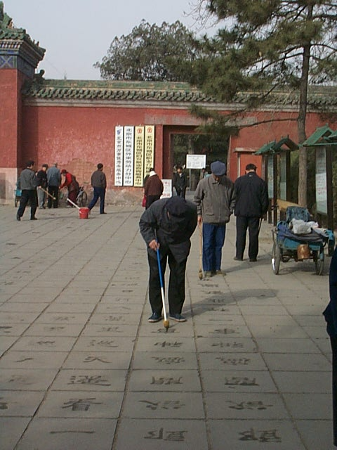However, in the mornings, in China, the old art form of Calligraphy is often practiced in the parks. Extended brushes, and water are the tools of choice used to write the Chinese characters on the concrete tiles. The old form, direction, top to bottom is used. The writer carefully centers each character in the tile and when the character is finished, the writer slowly steps backward to the next tile ...and so on down the column. An accomplished calligrapher is considered an artist.