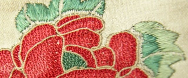 Note the contrast in the texture of the embroidery of the pink and red rose peddles and the "satin stitch" leaf peddles.