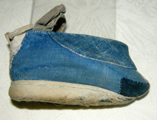 My favorite pair of lotus shoes were clearly made and worn by a peasant woman. She obviously walked everywhere. The shoes are plain, unadorned, patched, and the soles are worn through in places.